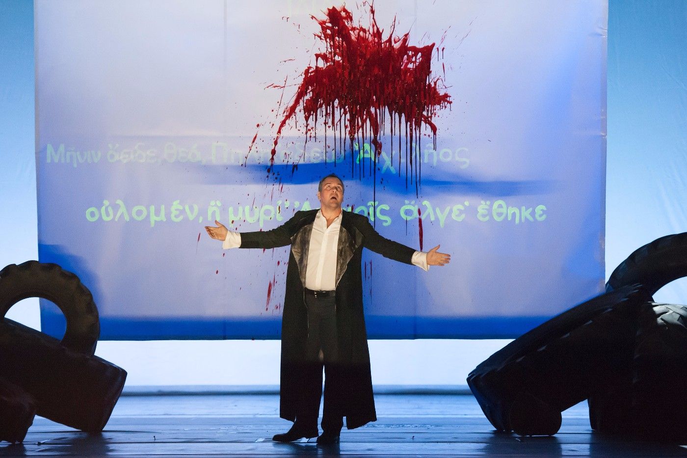 Homers berühmte Ilias ging im Salzburger Landestheater in moderner Fassung über die Bühne. Carl Philip von Maldeghem hat das Epos mit seinen 16.000 Versen verdichtet und erzählt den Kampf um Troja in fünf Sprachen. Nicht nur Schauspieler, sondern auch Sänger und Tänzer bevölkern die Bühne. Gregor Schleuning verkörpert den Superstar Achill, dessen Zorn kein vernünftiges Handeln mehr ermöglicht. (…) Eine turbulente Inszenierung, die das Publikum begeistert.