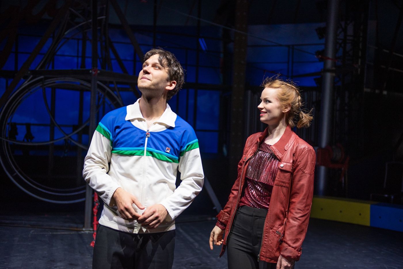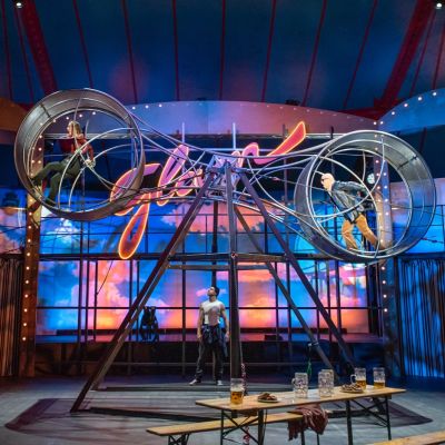 Auf riesigem, sich um die eigene Achse drehendem Stahlgestänge sind an den Enden zwei breite Laufräder, in die die Schauspieler - mit Karabinern gesichert - immer wieder einsteigen und in immensen Kreisbahnen rundum fliegen. Carl Philip Maldeghem formuliert diese akrobatischen Nummern zu erzählerischen Szenen: Beim ersten Flirt vom Schürzinger Eugen mit Karoline wird das zum lieblichen Schaukeln. Wenn allerdings der als Merkl Franz brutal und besoffen aufdrehende Georg Clementi und seine Erna einsteigen, machen allein sein Grölen und ihr Kreischen deutlich, von wie viel Sadismus und ängstlicher Abhängigkeit der beiden Gspusi genährt ist.